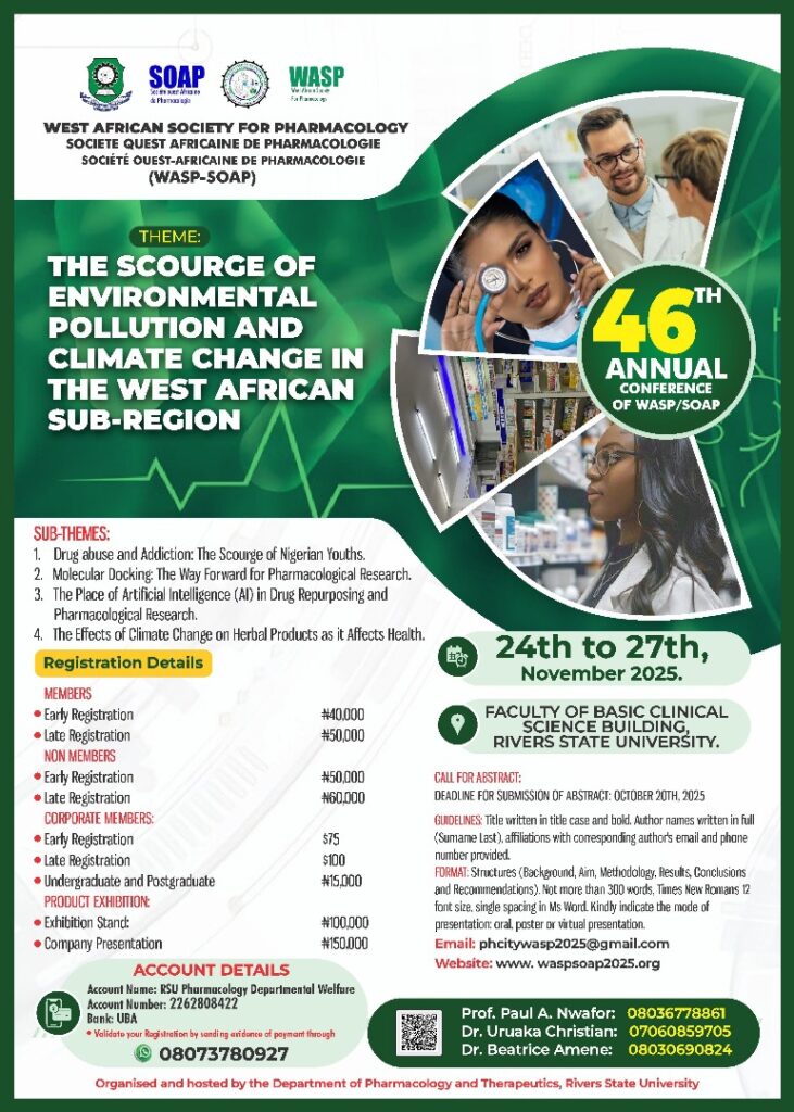 The West African Society for Pharmacology(WASP) invites scholars, researchers and practitioners in pharmacology and related fields to submit abstracts for presentation at the 2025 annual Conference.